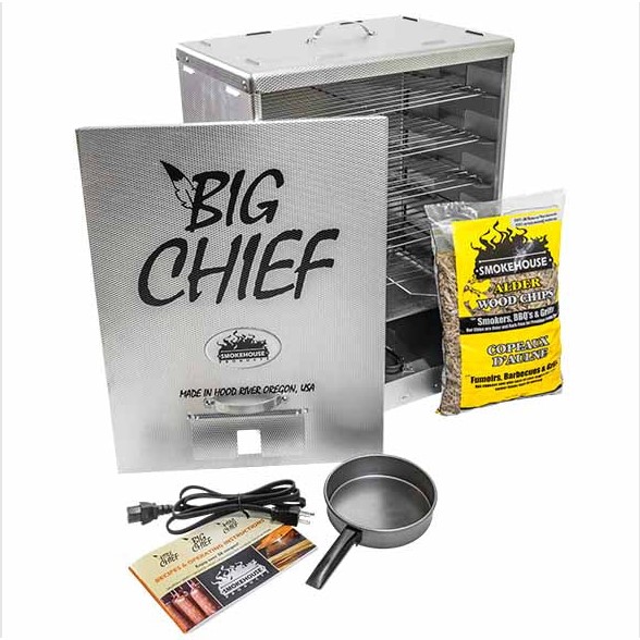 Smokehouse Products Front Load Big Chief Smoker #9894The Big Chief Front Load Electric Smoker is one of our more popular electric smoker and a customer favorite since its introduction shortly after the Little Chief in 1968. The Big Chief smokers are electric and plug into any standard 3-prong 110-120 AC outlet. The Big Chief heating element will heat the smoking chamber to approximately 165 degrees Fahrenheit. The Big Chief is perfect for smoking salmon, trout, other fish, jerky, sausage, fruits, nuts, cheese, turkey, bacon, hams, steaks and really any other types of foods. Why choose a Front Load Style over a Top Load Style Big Chief Smoker? The Front Load Style allows you to have access to each individual cooking grill. If you are cooking a variety of smoked foods (such as jerky and fish at the same time), the Front Load design allows you to remove one grill at a time, or rotate your grills top to bottom as needed. Features of the Front Load Big Chief Smoker:Size: 24-1/2? H x 18? W x 12? D Smokes up to 50 pounds of meat or fish Easy to use! Vented for proper dehydration Safe-UL, CUL, and CSA listed 120 Volt 450 watt heating element operates at approximately 165 degrees Uses standard 110 volt household current Durable, embossed aluminum construction Weight: 22 lbs. The Front Load Big Chief Smoker Includes:Free Recipe Booklet and complete operating instructions Free 1.75 lb. bag of Smokehouse Products Natural Wood Chips Electric cord, 5 Easy-Slide Chrome Plated Cooking Grills, Drip Pan, and Flavor Fuel Pan. Please note: this smoker is not a cooker. Use 3-wire plug and cord with a properly installed ground fault interrupter (GFI) circuit. Use the Big Chief only on a concrete or other non-combustible surface, and use it at least two feet from any combustible materials. The Big Chief should only be used outside. The Big Chief is Guaranteed to be free from manufacturing or component defects for a period of 2 years. Smokehouse Products is located in the beautiful Hood River Valley in the heart of The Columbia River Gorge. The Little Chief electric smoker was introduced in 1968 (under the Luhr Jensen brand) and enjoyed such success that the Mini Chief and Big Chief smokers soon followed. Today Smokehouse Products offers a full line of smoker accessories, including five flavors of chips and chunks, sausage making kits, sausage mixes, seasonings, jerky and dry rub mixes, drying screens, smoker insulation blankets, and replacement parts. Smokehouse Products is committed to supplying our customers with the very best smoker accessories on the market today and will continue to look for ways to enhance your experience using the Big Chief, Little Chief, and Mini Chief smokers. Older Smokers may carry the Luhr Jensen or Totem brand, instead of the current Smokehouse Products logo. This item proudly made in the U.S.A.