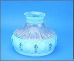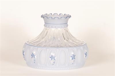 Aladdin Lamps 10" Glass Crystal Blue Meadow Shade, #M753 Hand-painted dainty blue flowers on a light blue crystal band is both elegant and charming. The shade combines both a blue tinted frosted and clear glass, which allows for the maximum light output while still producing a nice warm glow. Stunning when paired with Nickel or Chrome Table Lamps (new and old), clear or cobalt blue Short Lincoln Drapes. For use with Aladdin 10" under-burner shade rings (sold seperately) or any other oil, kerosene, or coal oil lamp with a 10" shade support. www.p65warnings.ca.gov.