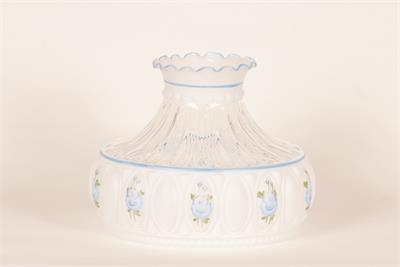 Aladdin Lamps 10" Glass Crystal Blue Rose Shade, #M750 This popular Crysal Rose shade features hand-painted blue roses with green accents on a frosted and clear shade. The shade combines both frosted and clear glass, which allows for the maximum light output while still producing a nice warm glow. Stunning when paired with a Nickel or Chrome Table Lamps, Clear or Cobalt Blue Short Lincoln Drapes. For use with Aladdin 10" under-burner shade rings (sold seperately) or any other oil, kerosene, or coal oil lamp with a 10" shade support.