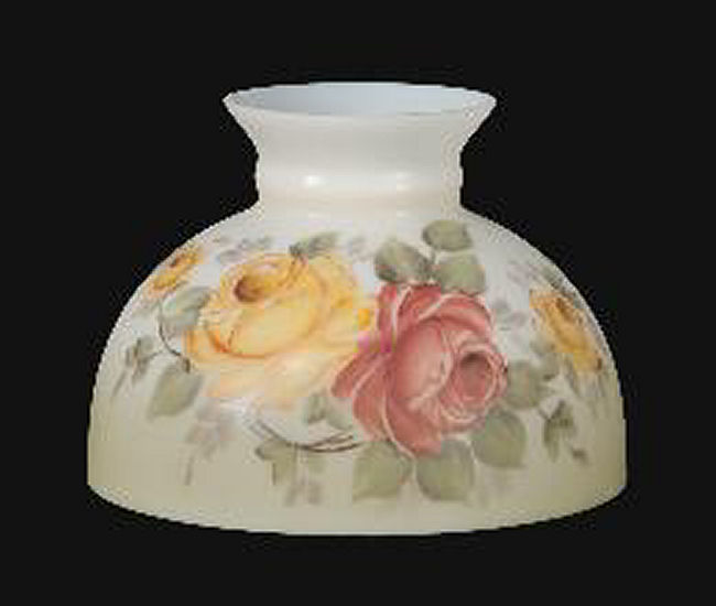 10" hand blown American-made opal glass student shade with "English Roses" decoration on a white background. Fits most non-electric, oil, coal oil or kerosene table lamps with 10" shade support. Classic student lamp shade shape with hand-painted floral.