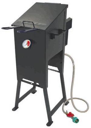 now stainless steel, Free-Standing Unit 2 Stainless Steel Baskets with Cool Touch Handles Temperature Gauge Drain Valve 10 PSI Preset Regulator with Brass Control Valve Stainless Braided Hose Made from 12-Gauge Steel Size: 17.5" x 17.25" x 26" Weight: 70.00