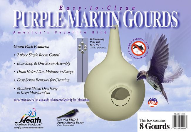 8-Pk. 2 Piece Easy Clean PM Gourd Starling Resistant/RH. Gourds are plastic. Entrance hole comes starling resistant with a perforrated removable piece which converts the hole to a round shape. Once perforrated piece is removed, it becomes permanently a round hole (cannot put the perforrated piece back on once removed).