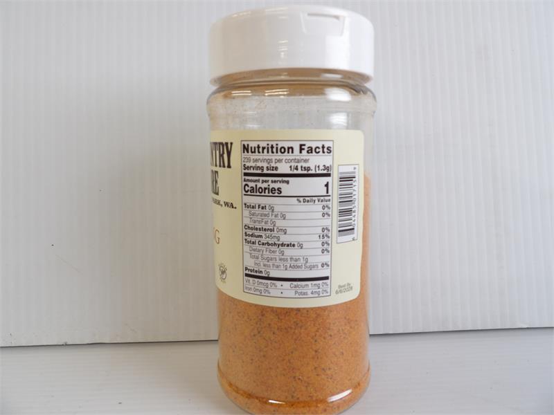 Ingredients: Sea Salt, Sugar, Dehydrated Onion & Garlic, Rice Flour, Paprika, Spices, Turmeric, and Silicon Dioxide added to prevent caking.