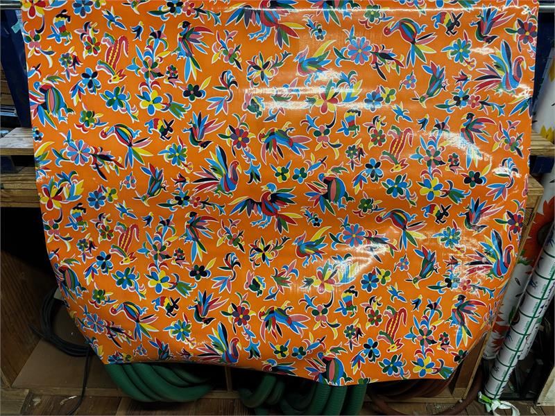 Aztec on Orange Oil Cloth, Full BoltOilcloth has been around for over a century and when it comes to making a bold color statement anywhere in your home. Oilcloth is a long-lasting, sturdy product that comes in vibrant colors. The oilcloth of yesteryear was resin-coated vinyl and the finish sometimes cracked or flaked. The new version is made of hi-tech plastic that won't crack but has the same colorful shine. Oilcloth has a mesh backing, which means it can really hold a stitch. It can be used for anything that needs to be durable and colorful--tablecloths, upholstered dining room chairs, curtains, bibs, lampshades, tissue boxes, outdoor chairs, etc. Your only limited by your imagination! Oil Cloth measures 48" wide & a full bolt equals 12 continuous yards (36 feet) Don't see the pattern or color you want? Please let us know and we will order it for you!