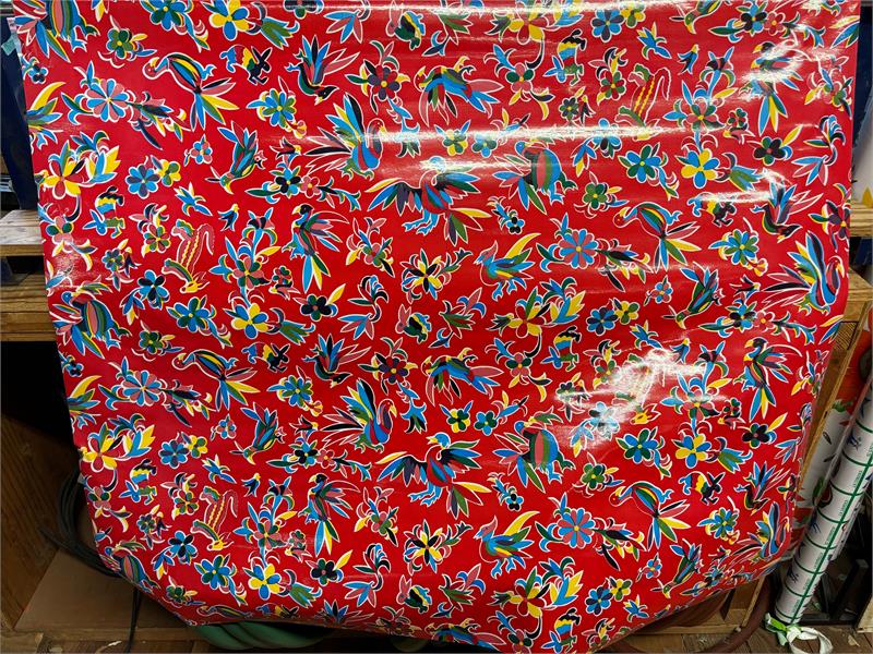 Aztec on Red Oil Cloth, YardageOilcloth has been around for over a century and when it comes to making a bold color statement anywhere in your home. Oilcloth is a long-lasting, sturdy product that comes in vibrant colors. The oilcloth of yesteryear was resin-coated vinyl and the finish sometimes cracked or flaked. The new version is made of hi-tech plastic that won't crack but has the same colorful shine. Oilcloth has a mesh backing, which means it can really hold a stitch. It can be used for anything that needs to be durable and colorful--tablecloths, upholstered dining room chairs, curtains, bibs, lampshades, tissue boxes, outdoor chairs, etc. Your only limited by your imagination! Oil Cloth measures 48" wide & a full bolt equals 12 continuous yards (36 feet) Don't see the pattern or color you want? Please let us know and we will order it for you!