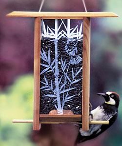 The Teahouse collection of bird feeders are made of redwood and double etched glass panels. The design is beautiful and functional; the top slides up for easy to refilling, the unique design protects the seeds from the elements. Lower perch is removable for easy cleaning. This item proudly made in the U.S.A.