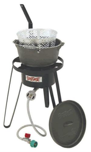 High Pressure Burner 21" Tall Welded Steel Frame 14" Diameter Cooking Surface 8.5-Qt. Cast Iron Fry Pot with Lid Perforated Aluminum Basket 36" Stainless Braided Hose 10 PSI Adjustable Regulator 360 Windscreen Protection Size: 18.32" x 19.25" x 22.82" Weight: 43.10