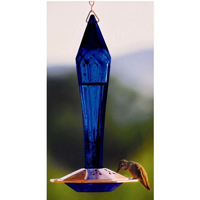 The faceted glass hummingbird feeder is brilliant in color and contemporary in style. Features a finely crafted copper base which allows hummingbirds to perch or hover while feeding through the open cut sunlit ports. This feeder is easy to fill and clean and is leak free. Comes with nectar recipe. This item proudly made in the U.S.A.