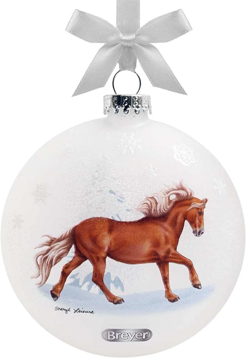 Almost every equestrian has had a special pony in their life, and this year’s Artist Signature Ornament celebrates them! This double-sided, flat frosted glass ornament features glittering snowflakes and two works of art inspired by Breyer models. Designed by artist Sheryl Leisure, one side features a joyful chestnut pony romping through the snow, and the other features a dun Chincoteague Pony mare and foal on a snow-kissed beach.