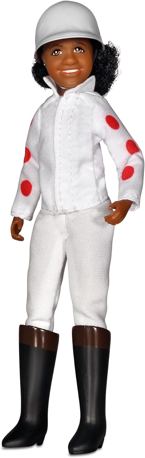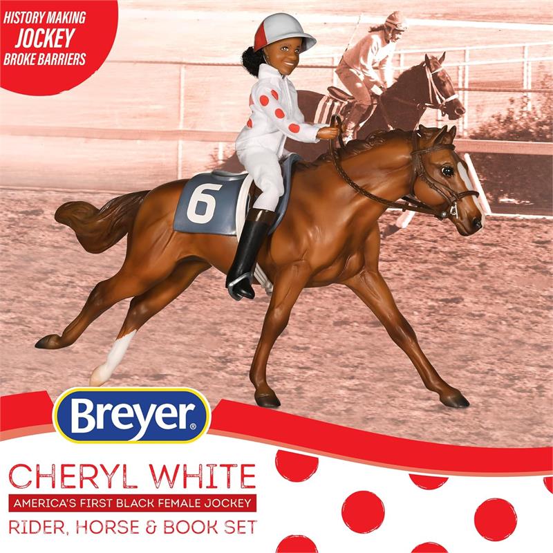 This gift set includes a 1:12 scale genuine Breyer model horse of Jetolara, race saddle and bridle, and fully-posable figure of Cheryl.