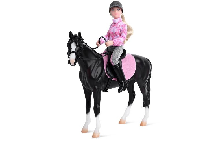 Whether riding in the show ring or for a round of practice, our English rider Lauren and her beautiful dark, seal bay horse, Logan, are ready to leap into action! This horse and rider set includes a 6” posable rider in pretty pink riding gear, a Freedom Series horse, a pink saddle pad to match the rider's outfit, an English saddle, and bridle.