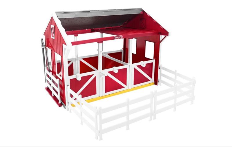 This complete stable includes attached saddle racks and bridle hooks, as well as four pieces of fencing that can create a paddock attached to the barn or used separately.