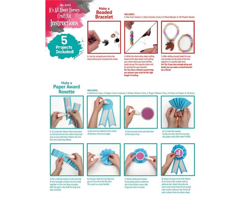 INCLUDES 5 PROJECTS: 1. Paint a Stablemate Horse 2. Make a Beaded Bracelet 3. Decorate a Horseshow 4. Sew a felt horse 5. Make a paper award rosette. Stablemates 1: 32 Scale. Stablemates Horse measures approximately 3. 5" L x 3.5" H. Recommended for ages 8 years and older.