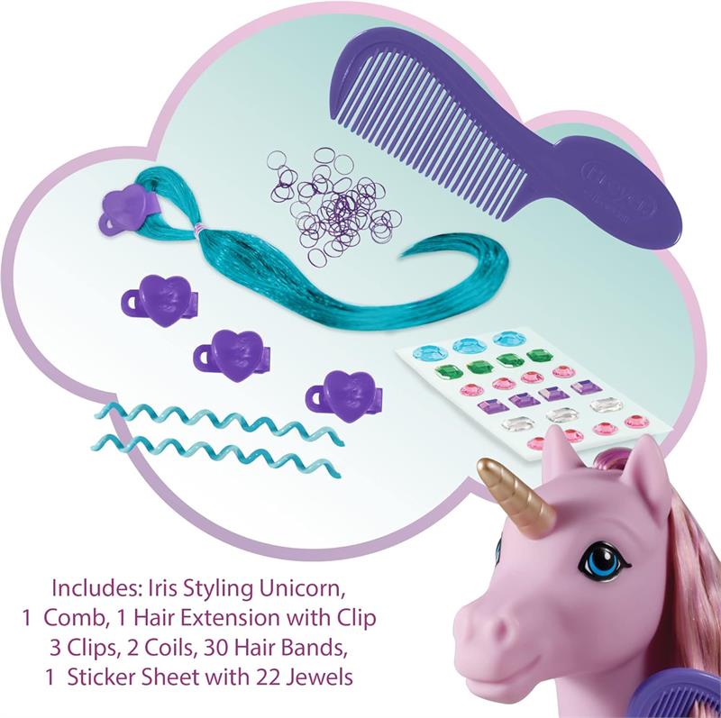 Meet Iris - our new styling pony magical unicorn! Bring your hair creations to life and design glamorous hair styles with her tangle-free mane and tail. Add hair accessories and gem stickers to make your own unique creation!