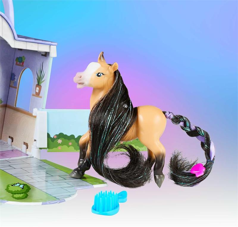 Playset includes Petal the horse, take-along shop with accessories and stickers, colorful hair extension with clip, and brush - 10 pieces in all!