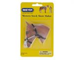 Dark brown, Western style show halter comes with silver-tone engraved plates and buckles. This set includes lead rope with chain and working clasp. Designed to fit most Traditional Size Model Horses.