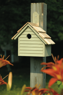 Charming New England design finished with beautiful Heartwood shingled roof, copper trim and rich semi-transparent stain (non-toxic, of course!) give this home real character, while great ventilation, drainage and convenient rear clean-out door mean years and years of delightful use. Mounting paddle attached for easy hanging.