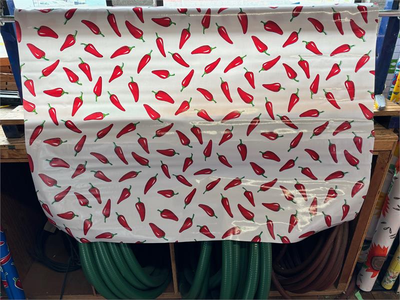 Chiles Green on Red Oil Cloth, Full Bolt of 12 Yards.Oilcloth yardage in a hot and spicy design. Bring out the jalapeños, habaneros, and cayenne peppers for your kitchen and patio. Its small print makes it perfect for sewn accessories.