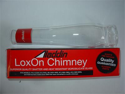 The Aladdin Lox-On Chimney was originally introduced with the Model 12 burner, setting it apart from other kerosene and coal oil lamps on the market at that time. The unique Lock On style features a twist and lock design. The Lox-On Chimneys have three small tabs at the base of the chimney which corresponds to the three metal tabs on the Lox On Gallery. These tabs meet up to hold the Aladdin chimney securely in place. Due to the Lox-On style, it is important not to over tighten the chimney into the Lox-On gallery, or the chimney may crack when the lamp is in operation. The chimney should be "finger-tight" within the Lox On Gallery. The tabs on the gallery can be easily adjusted with a pair of pliers to provide a custom fit to your chimney. (All Aladdin chimneys are made of hand-blown glass and vary slightly.)