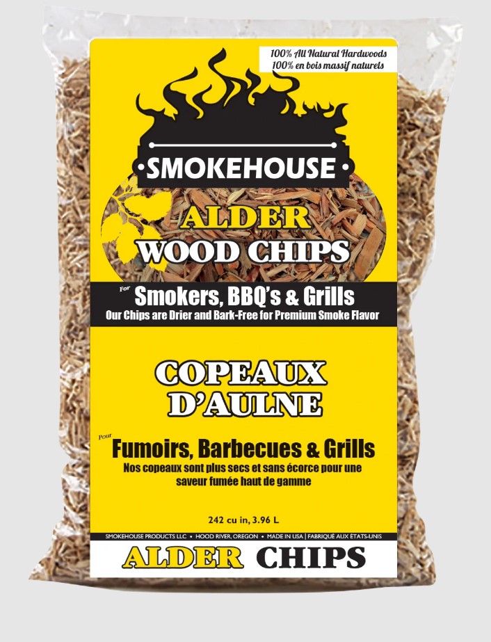 Smokehouse Products Wood Chips Alder Flavor #9780Alder has a nice, light smoke flavor, good all-purpose smoke. For use on all meats and fish, from smoked salmon to jerky. Alder wood produces a neutral, balanced smoke that has long been a sportsman's favorite for smoking salmon, trout, seafood and really any type of other meats. Because of the neutral characteristics of alder, it is works wonderfully when blended with other wood species, especially fruit wood. When using alder with meats such as steak, ribs and briskets, try mixing alder with our fruit wood species like apple and cherry for a delectable taste you're sure to love. 1 3/4-pound bag. Smokehouse brand Wood Chips are thoroughly dried, and all of the bitter tree bark has been removed to ensure 100% natural wood and maximum wood smoke. The wood chips are precision ground for an even, consistent burn. Chips work in electric and propane food smokers, Grills, and Bar B Ques. Smokehouse Products is located in the beautiful Hood River Valley in the heart of The Columbia River Gorge. The Little Chief electric smoker was introduced in 1968 (under the Luhr Jensen brand) and enjoyed such success that the Mini Chief and Big Chief smokers soon followed. Today Smokehouse Products offers a full line of smoker accessories, including five flavors of wood chips, sausage making kits, sausage mixes, seasonings, jerky and dry rub mixes, drying screens, smoker insulation blankets, and replacement parts. Smokehouse Products is committed to supplying our customers with the very best smoker accessories on the market today and will continue to look for ways to enhance your experience using the Big Chief, Little Chief, and Mini Chief smokers. Older Smokers may carry the Luhr Jensen or Totem brand, instead of the current Smokehouse Products logo. This item proudly made in the U.S.A.