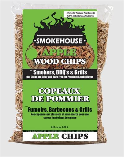 Smokehouse Products Wood Chips Apple Flavor #9770Apple wood produces a mildly sweet smoke that is ideal for any cut of meat, including pork, beef and poultry. Its sweet flavor can also be used to enhance the flavor of nearly any food and has grown to be the favorite of many professional BBQ enthusiasts. If you want to control the extent of your flavor from the Apple Wood Chips, try mixing the apple wood with our Alder Wood Chips, which adds a neutral, balanced smoke without interfering with the sweetness of the apple wood. Don't be afraid to try the Apple Wood Chips on any recipe, from smoked cheese to pork and ribs. Here at Smokehouse Products, we love to smoke cheese with apple wood give it a try! 1 3/4-pound bag. Smokehouse brand Wood Chips are thoroughly dried, and all of the bitter tree bark has been removed to ensure 100% natural wood and maximum wood smoke. The wood chips are precision ground for an even, consistent burn. Chips work in electric and propane food smokers, Grills, and Bar B Ques.