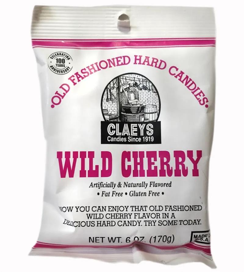 Claey's Wild Cherry Candy 6 oz. bag sweet as a ripe cherry Since 1919, Claey's has been making traditional hard sanded candies. Each batch is made to the same recipe as the originals. Bursting with just picked freshness! Wonderfully flavorful. Check out our complete selection of: Claey's Candy