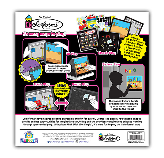 Colorfoms® have inspired creative expression and fun for over 60 years! These classic, re-stickable shapes provide endless opportunities tor Imaginative storytelling and the countless combinations enhance teaming through open ended play. With pieces that Stick Like Magic™, it’s more fun to play the Colorforms® way!
