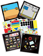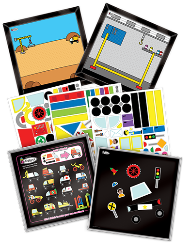 Product Features of the Colorforms Vehicle Picture Panels Play Set #1106: 154 re-stickable Colorforms® pieces 2 double-sided, magnetic-framed Picture Panels