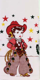 Howdy Lil' Buckaroo! This fun Cowboy print flour sack towel would look at home in any country kitchen, cabin, or chuckwagon. 100% Cotton flour sack towel measures 17" x 24". Brand New with Tags.