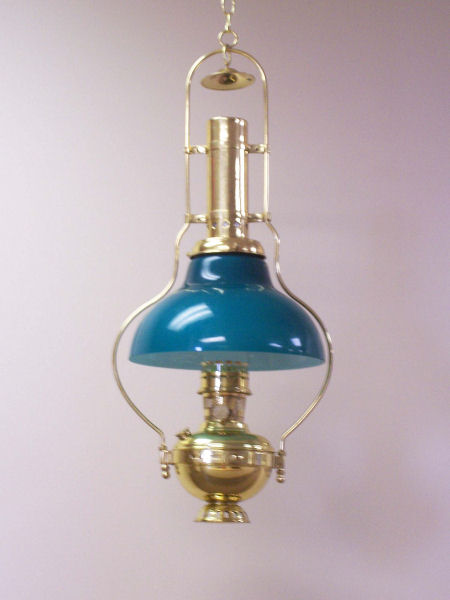 Aladdin Lamps Deluxe Brass Hanging Lamp with Green Bell Shade, #BH210GThis lamp is available with Kerosene or Electric Burner. Please use the pull down menu to make your selection. The Deluxe Brass Hanging lamp is without a doubt the finest brass kerosene mantle lamp in the world today. Original styling of the lamp dates to 1907, when Aladdin founder Vicotor S. Johnson, Sr. introduced the Aladdin Practicus. The Deluxe Brass Hanging Lamp is crafted from solid, heavy-gauge brass with hand-soldered joints and is submerged water-tested for leakage to five atmospheres. Largest fuel capacity (1 1/5 quarts or approximately 18 hours) of all table lamps. Fill cap for easy refilling. The Aladdin Deluxe Brass Hanging Lamp adds luminous elegance to any setting. 28" Overall height (plus 18" of brass chain included). Lamp needs a minimum of 12" clearance from top of chimney to ceiling. This lamp is also available with an Opal White Shade instead. If you wish to purchase that combination, please search for BH210. About Model 23 Aladdin Kerosene Mantle Lamps:The Model 23 Aladdin Lamp produces 60 watts of bright, white light without smoke or odor. The unique round wick and mantle combination of the burner provides you with a steady, bright white light making it an ideal choice for power outages or off the grid living. The Aladdin Lamp using K-1 kerosene, which is economical and easy to find. A quart of kerosene will provide you with approximately 12 hours of light. The Model 23 burner also produces around 2,000 BTUs per hour, providing heat as well. Choosing Electric or Kerosene for your Aladdin LampWe offer all of our Aladdin Lamps with the option of electric or kerosene. The kerosene burner produces a wonderful, safe, bright white light for non-electric situations such as power outages. The Aladdin Lamps have been in use since 1908. Electric Burners (also referred to as converters) use the same burner body as the kerosene burners to acheive the same look as kerosene. The design of the electric burner keeps all of the wiring within the burner and a turn-knob replaces the wick raiser. The gallery also has the same look, but is not interchangeable with the kerosene gallery. The Aladdin Chimney also fits the electric burner. The electric burner is designed so you can keep your lamp font (base) full of kerosene if you choose, and have it ready for power outages, while using your lamp on a daily basis as an electric lamp.  WARNING Using this product can expose you to chemicals including lead which is known to the state of California to cause cancer, and carbon monoxide, which is known to the state of California to cause developmental toxicity. For more information go to www.p65warnings.ca.gov.