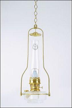 Aladdin Lamps Deluxe Glass Hanging Lamp, Clear (less shade), #BH715This lamp is available with Kerosene or Electric Burner. Please use the pull down menu to make your selection. Our Deluxe Glass Hanging Lamp brings a disctinctive touch of country charm to any home. With its stylish stippled-finish glass bowl, solid brass frame, this lamp fits easily into any early American decor. The disctinctive tilt frame hanger makes it easy to remove for refilling. The warm, friendly glow from this Aladdin lamp will provide countless nighttime hoursof tranquillity, reminiscent of a more peaceful, simple time. Lamp can double as a shelf or table lamp. 24" overall height (plus 18" brass chain included), 7" lamp base diameter, 1 quart kerosene capacity. This lamp needs a minimum clearance of 12" from the top of the chimney to the ceiling. About Model 23 Aladdin Kerosene Mantle Lamps:The Model 23 Aladdin Lamp produces 60 watts of bright, white light without smoke or odor. The unique round wick and mantle combination of the burner provides you with a steady, bright white light making it an ideal choice for power outages or off the grid living. The Aladdin Lamp using K-1 kerosene, which is economical and easy to find. A quart of kerosene will provide you with approximately 12 hours of light. The Model 23 burner also produces around 2,000 BTUs per hour, providing heat as well. Choosing Electric or Kerosene for your Aladdin LampWe offer all of our Aladdin Lamps with the option of electric or kerosene. The kerosene burner produces a wonderful, safe, bright white light for non-electric situations such as power outages. The Aladdin Lamps have been in use since 1908. Electric Burners (also referred to as converters) use the same burner body as the kerosene burners to acheive the same look as kerosene. The design of the electric burner keeps all of the wiring within the burner and a turn-knob replaces the wick raiser. The gallery also has the same look, but is not interchangeable with the kerosene gallery. The Aladdin Chimney also fits the electric burner. The electric burner is designed so you can keep your lamp font (base) full of kerosene if you choose, and have it ready for power outages, while using your lamp on a daily basis as an electric lamp.  WARNING Using this product can expose you to chemicals including lead which is known to the state of California to cause cancer, and carbon monoxide, which is known to the state of California to cause developmental toxicity. For more information go to www.p65warnings.ca.gov.