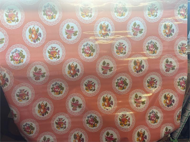 Doily with Fruit on Salmon Oil Cloth, Full BoltOilcloth has been around for over a century and when it comes to making a bold color statement anywhere in your home. Oilcloth is a long-lasting, sturdy product that comes in vibrant colors. The oilcloth of yesteryear was resin-coated vinyl and the finish sometimes cracked or flaked. The new version is made of hi-tech plastic that won't crack but has the same colorful shine. Oilcloth has a mesh backing, which means it can really hold a stitch. It can be used for anything that needs to be durable and colorful--tablecloths, upholstered dining room chairs, curtains, bibs, lampshades, tissue boxes, outdoor chairs, etc. Your only limited by your imagination! Oil Cloth measures 48" wide & a full bolt equals 12 continuous yards (36 feet) Don't see the pattern or color you want? Please let us know and we will order it for you!