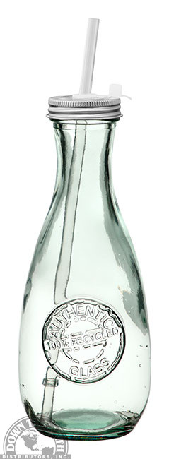Drinking Jar with Metal Lid, Reusable Straw and Handle. Embossed with decorative emblem. Clear Green Recycled Glass, 18 oz. capacity. Perfect for everyday use either on the go or casual entertaining on the deck or patio.
