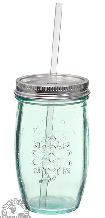 Drinking Jar with Metal Lid, Reusable Straw and Handle. Embossed with decorative emblem. Clear Green Recycled Glass, 18 oz. capacity. Perfect for everyday use either on the go or casual entertaining on the deck or patio.