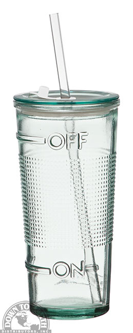 Drinking Tumbler with Metal Lid and Reusable Straw, 15 oz. Embossed with decorative emblem. Clear Green Recycled Glass. Perfect for everyday use either on the go or casual entertaining on the deck or patio.