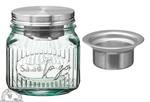 Drinking Jar with Metal Lid, Reusable Straw and Handle. Embossed with decorative emblem. Clear Green Recycled Glass, 18 oz. capacity. Perfect for everyday use either on the go or casual entertaining on the deck or patio.