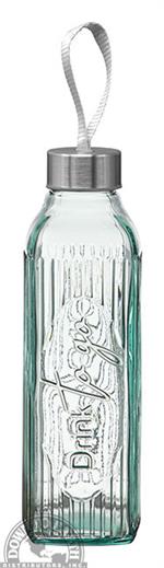 Drink To Go Bottle. Recycled glass. Clear. Ribbed texture for better grip. Carrying strap. Perfect for everyday use on the go or casual entertaining on the deck or patio. Due to the nature of recycled glass, some color variation is to be expected.