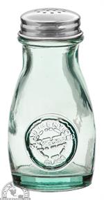 "Authentic" Shaker with Stainless Steel Cap. Embossed with "Authentic 100% Recycled Glass" seal. Clear Green Recycled Glass. 4 oz. capacity. Perfect for salt, pepper and ground spice.