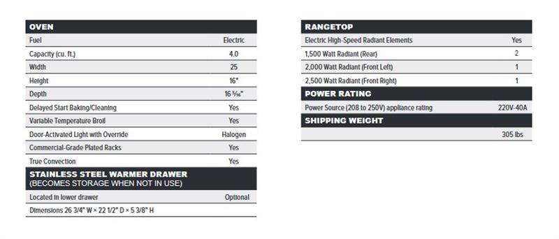 A 4.0 cu. ft. true convection oven offers the space and capacity you need. Convenient self-cleaning feature (with delayed start) is standard. Dual halogen lights with over-ride let you see what’s cooking with the door open or closed. The true convection oven has a third heating element surrounding the convection fan. Hot air circulates evenly, providing speed and consistent professional results.