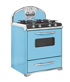 Elmira Stove Works 30" 4-Burner Natural Gas Top, Electric Self-Cleaning Convection Oven with Chrome Trim, Tropical Blue #1955-C