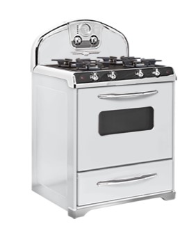 Elmira Stove Works 30" 4-Burner Natural Gas Top, Electric Self-Cleaning Convection Oven with Chrome Trim, White #1955-C