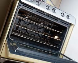 A 5.0 cu. ft. true convection oven offers the space and capacity you need. Convenient self-cleaning feature (with delayed start) is standard. Dual halogen lights with over-ride let you see what’s cooking with the door open or closed. The true convection oven has a third heating element surrounding the convection fan. Hot air circulates evenly, providing speed and consistent professional results.
