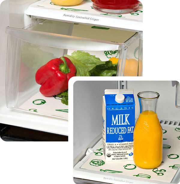 Measure the bottom of the refrigerator tray, shelf or drawer and cut liner to desired size. Place the liner on the bottom of the drawer or shelf. Fruits, vegetables and other containers should be placed on top of the liner.