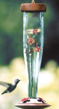 Our hummingbird lanterns feature a hand-lathed redwood base complete with brass accent ring containing three ruby anodized flowers. The bottle is beautiful art quality glass. This design is leak free and easy to clean and refill. 12" Tall, holds one pint. This item proudly made in the U.S.A.