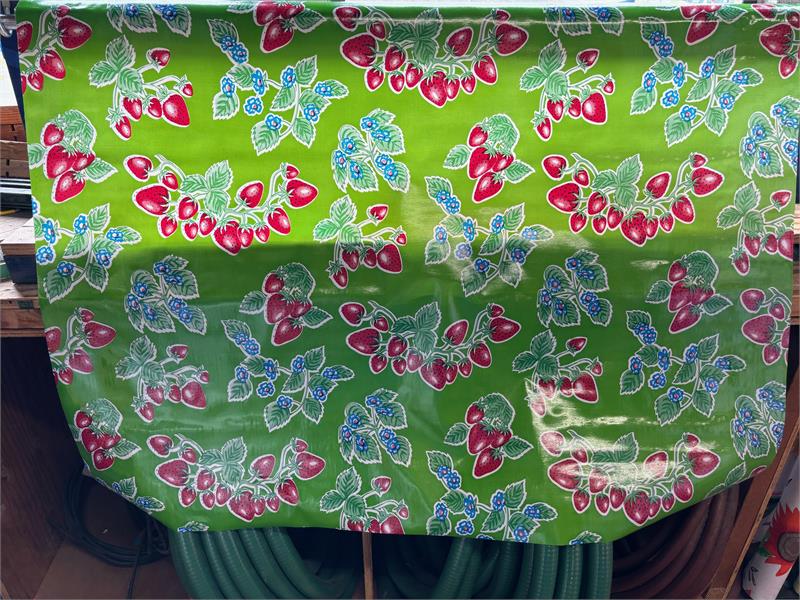 Forever Summer on Green Oil Cloth, Full BoltOilcloth has been around for over a century and when it comes to making a bold color statement anywhere in your home. Oilcloth is a long-lasting, sturdy product that comes in vibrant colors. The oilcloth of yesteryear was resin-coated vinyl and the finish sometimes cracked or flaked. The new version is made of hi-tech plastic that won't crack but has the same colorful shine. Oilcloth has a mesh backing, which means it can really hold a stitch. It can be used for anything that needs to be durable and colorful--tablecloths, upholstered dining room chairs, curtains, bibs, lampshades, tissue boxes, outdoor chairs, etc. Your only limited by your imagination! Oil Cloth measures 48" wide & a full bolt equals 12 continuous yards (36 feet) Don't see the pattern or color you want? Please let us know and we will order it for you!