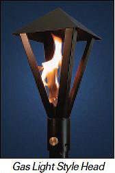 Gas Light Style Head Head Dimensions: 19 Tall x 9 Diameter NOTE: We strongly recommend Professional Installation of all Permanent Mount Patio Lights. Available as Portable or Permanent Mount. If ordering this unit as a replacement for your existing torch setup, please be prepared to provide your SERIAL NUMBER and verify it was manufactured by FLAME ENGINEERING. We do not sell these parts as substitutes for any other manufacturers products. Stands a total of 90 1/2" PATIO LIGHT SPECIFICATIONS:LP Gas Usage (11 wc) Natural Gas Usage (6.5 oz)@49,000 BTU (max) .5 gal./hr. @49,000 BTU (max) 49 cu. ft./hr.@18,000 BTU (min) .2 gal./hr. @18,000 BTU (min) 18 cu. ft./hr.Patio Light Head Clearance Requirements3 Feet Radius 6 Feet HeightPatio Light Pole DimensionsAll Poles are 21/2 in Diameter Portable Poles Approx. 733/4 TallPermanent Poles Approx. 821/4 TallPermanent Patio Light Pressure Requiremetsat the Base of the LightLP Gas - 11 wc Natural Gas - 6.5 oz