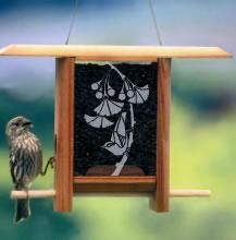 The Teahouse collection of bird feeders are made of redwood and double etched glass panels. The design is beautiful and functional; the top slides up for easy to refilling, the unique design protects the seeds from the elements. Lower perch is removable for easy cleaning. This item proudly made in the U.S.A.