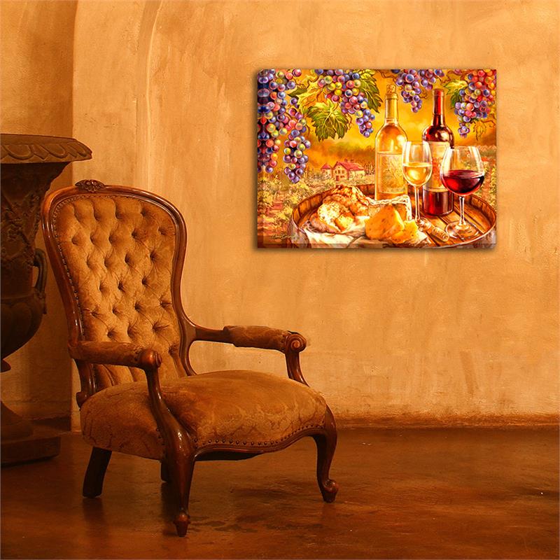 In vino veritas is a Latin phrase that means "in wine, truth", suggesting a person under the influence of alcohol is more likely to speak their hidden thoughts and desires. This painting features red and white wine, grapes, and a Tuscan villa.