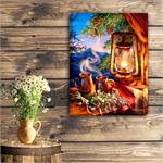 Santa is caught napping, fast asleep in his rocking chair. A tabby cat sits on his lap, while Santa rests besides his crackling stone fireplace and brightly decorated Christmas tree. A warm cup of cocoa sits on the table with some cookies.