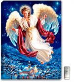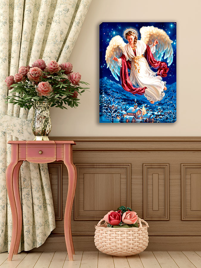 An elegant angel soars above a winter mountain side town scene. Brilliant sapphire blue night sky with stars above. Town features snow capped buildings, and a church with steeple.